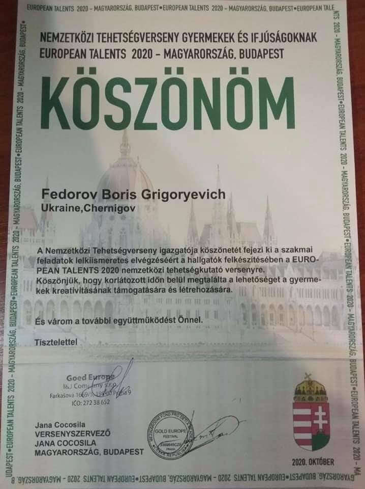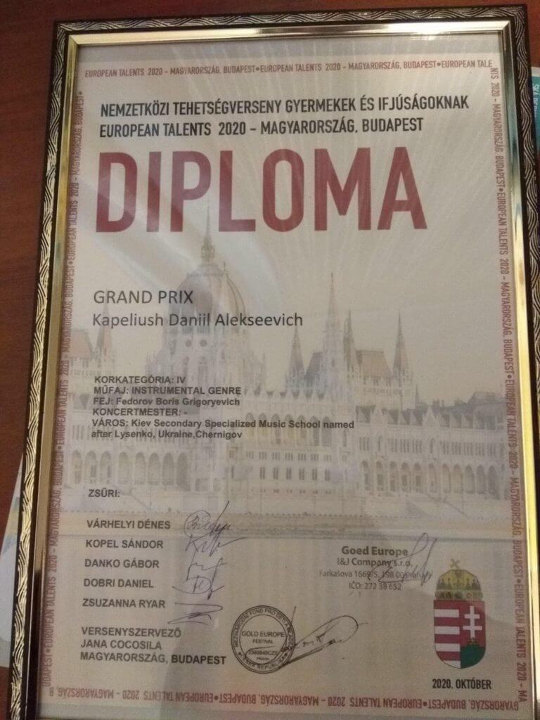 Нещодавно в Будапешті (Угорщина) відбувся Міжнародний багатожанровий дистанційний конкурс EUROPEAN TALENTS 2020, у якому взяв участь, учень 9-Б класу фортепіанного відділу Київської середньої спеціалізованої музичної школи-інтернату ім. М.В Лисенка, Данило Капелюш (клас викладача Бориса Григоровича Федорова).