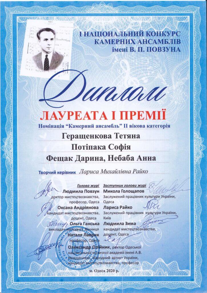 У номінації «Камерний ансамбль» (ІІ вікова категорія), одностайним рішенням журі, І премію здобули учениці Київської середньої спеціалізованої музичної школи імені М.В. Лисенка. Учасниці ансамблю, а саме: Тетяна Геращенкова (скрипка), Софія Потіпака (альт), Дарина Фещак (віолончель) та Анна Небаба (фортепіано) навчаються у класі заслуженого працівника культури України, викладача-методиста КССМШ-інтернату ім. М. В. Лисенка – Лариси Михайлівни Райко.