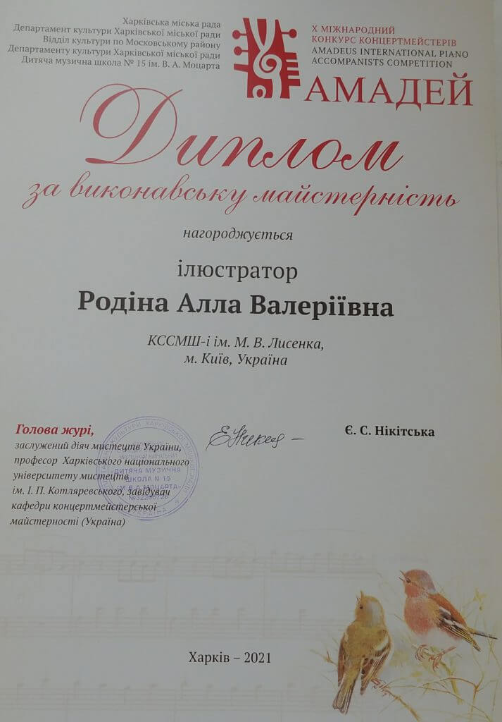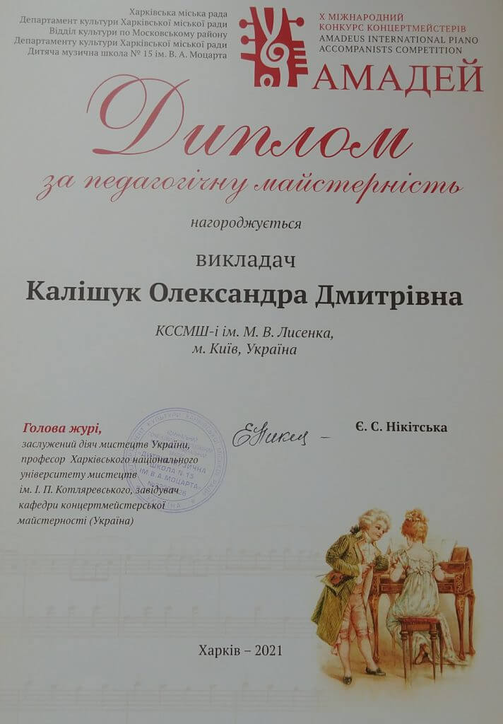 На початку березня 2021 року в Харкові відбувся X Міжнародний конкурс концертмейстерів АМАДЕЙ, який проходить один раз на два роки. Серед членів журі ювілейного конкурсу були представники України, Німеччини та США: Є. Нікітська, Т. Молчанова, Х.-М. Шрайбер, А. Цигічко, Е. Ларсен. Учні КДМЛ ім. М.В. Лисенка не вперше представляють заклад на цьому престижному конкурсі. Серед цьогорічних переможців відзначимо: