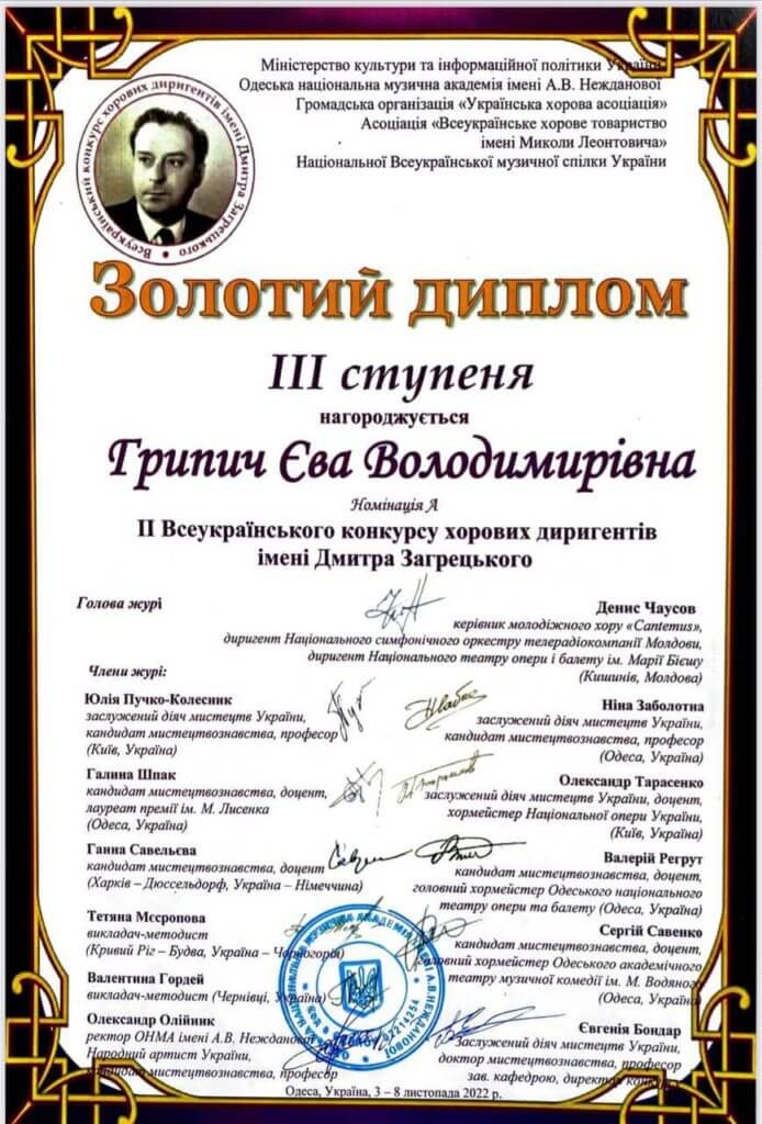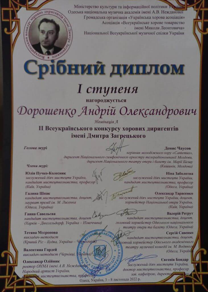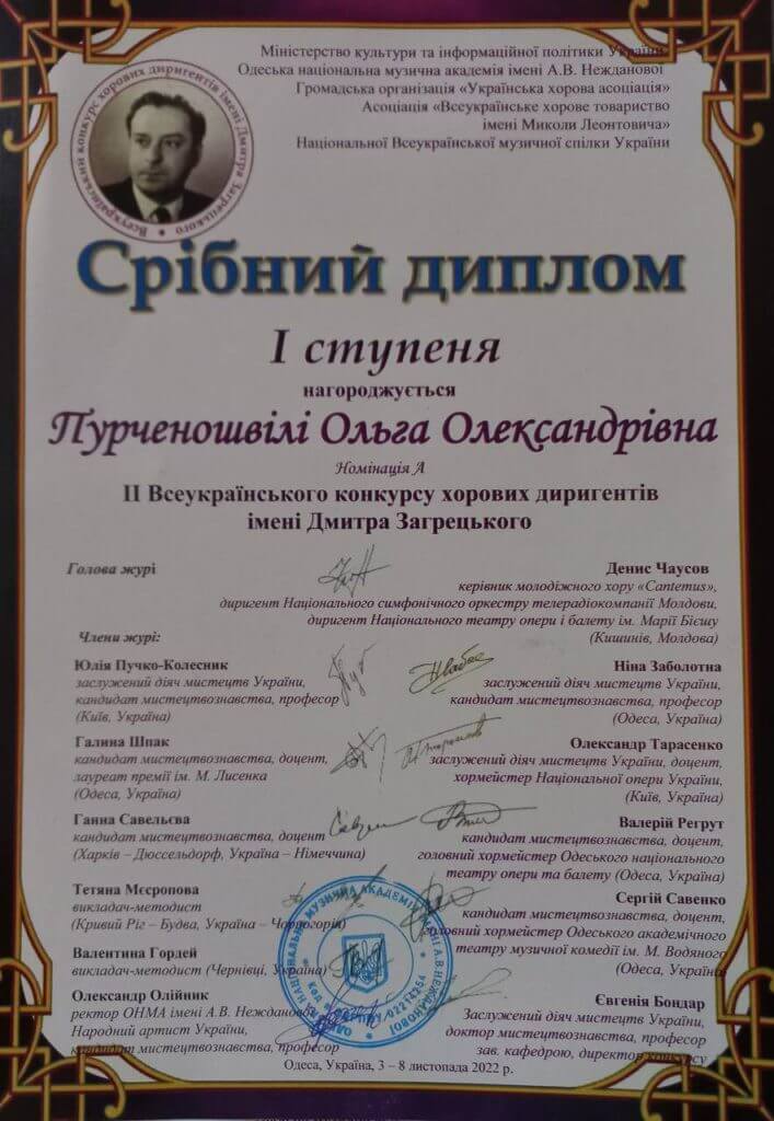 У листопаді 2022 року в Одесі відбувся ІІ Всеукраїнський конкурс хорових диригентів імені Дмитра Загрецького. До складу журі конкурсу увійшли видатні педагоги та музиканти з усієї України. Серед них: Ніна Заболотна, Олександр Тарасенко, Валерій Регрут, Сергій Савенко, Євгенія Бондар, Юлія Пучко-Колесник, Галина Шпак, Ганна Савельєва, Тетяна Месропова, Валентина Гордей та Олександр Олійник. Очолив знане журі диригент Національного театру опери і балету ім. Марії Бієшу в Кишеневі – Денис Чаусов.