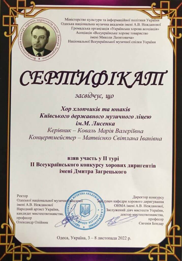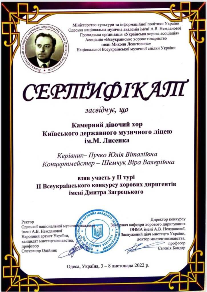Хори КДМЛ ім. М.В. Лисенка також представили ліцей у другому турі хорового конкурсу імені Дмитра Загрецького, серед них: