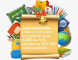 Оголошується додатковий набір учнів в 2-10 класи на вакантні місця КДМЛ ім. М.В. Лисенка на 2021-2022 навчальний рік з таких спеціальностей: фортепіано, скрипка, альт, віолончель, контрабас, арфа, флейта, кларнет, гобой, фагот, валторна, труба, тромбон, ударні інструменти, гітара, бандура, теорія музики – 8-9 класи, хорове диригування (хор хлопчиків 2-9 класи, камерний хор