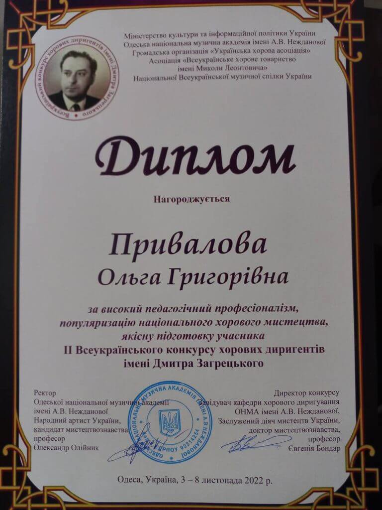 In november 2022, the second all-ukrainian dmytro zahretskyi choral conducting competition was held in odesa. The jury consisted of prominent teachers and musicians from all over ukraine. Among them: nina zabolotna, oleksandr tarasenko, valeriy regrut, serhii savenko, yevheniia bondar, yuliia puchko-kolesnyk, halyna shpak, hanna saveliieva, tetiana mesropova, valentyna hordei and oleksandr oliinyk. The renowned jury was headed by denys chausov, conductor of the maria biesiu national opera and ballet theater in chisinau.