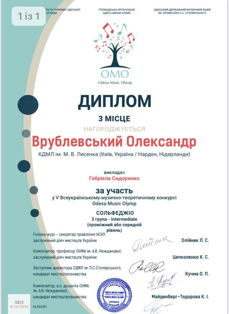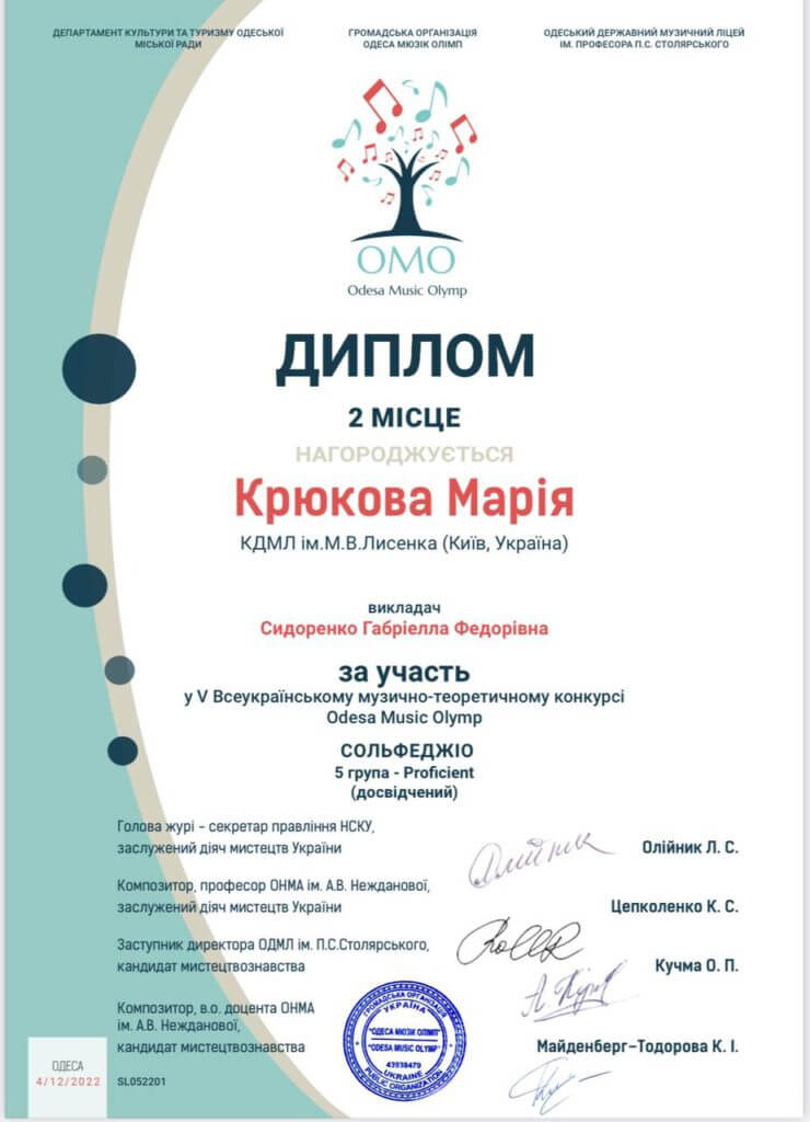 4 грудня відбувся V Всеукраїнський музично-теоретичний конкурс Odesa Music Olymp. На цьому випробовуванні учні КДМЛ ім. М.В. Лисенка проявили свої теоретичні навички, вміння та знання і здобули призові місця у номінації Сольфеджіо. Вітаємо Марію Крюкову (2 місце) та Олександра Врублевського (3 місце), а також їх викладача Габріеллу Сидоренко.