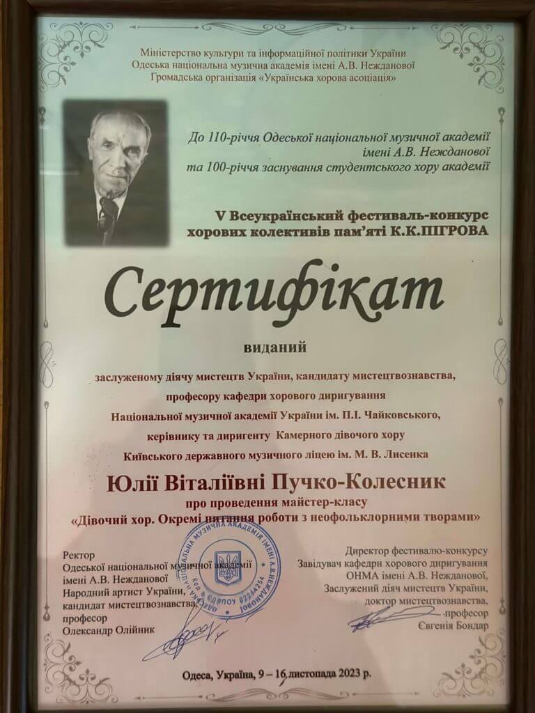 12 листопада 2023 р. на сцені Одеської національної музичної академії імені А.В. Нежданової відбувся V Всеукраїнський фестиваль-конкурс хорових колективів памʼяті К.К. Пігрова.