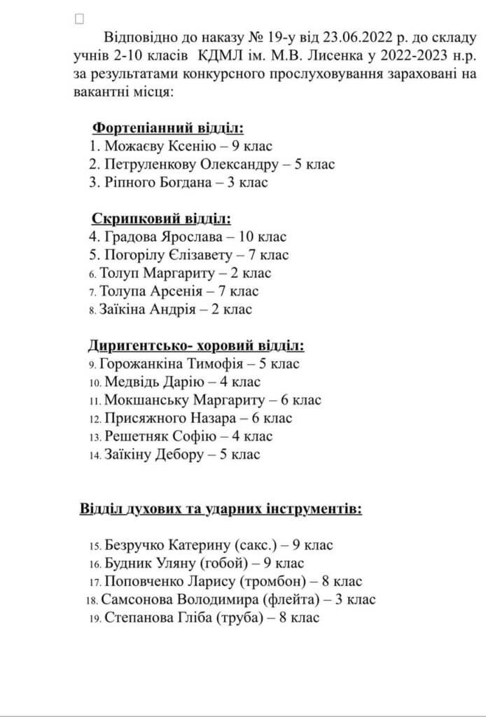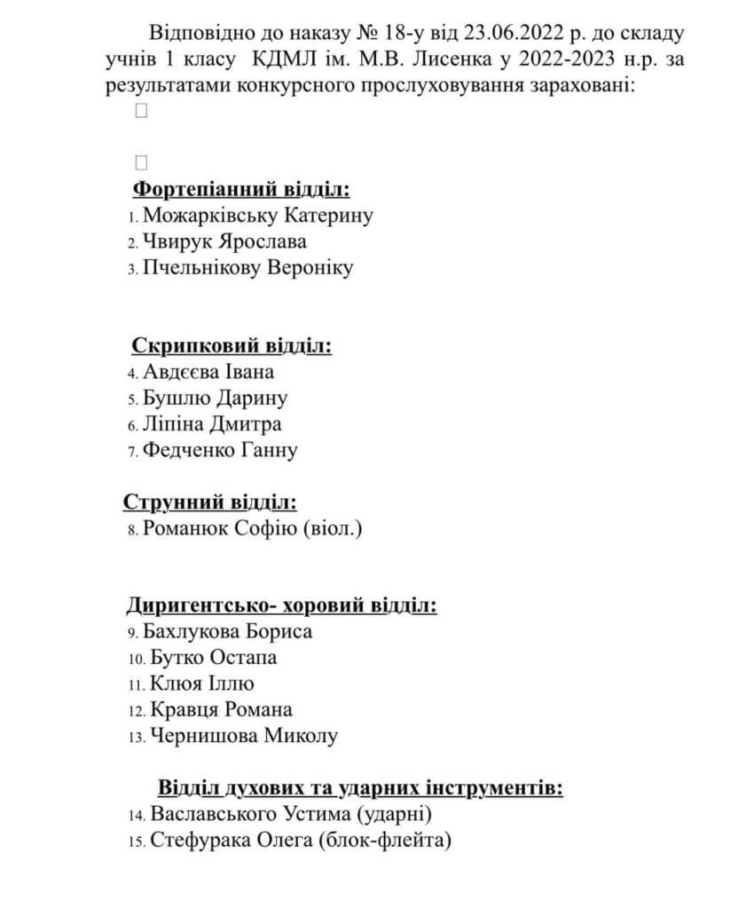 У зв’язку з дією на території України воєнного стану конкурсний набір 2-9 класи КДМЛ ім. М.В. Лисенка на 2022-2023 навчальний рік буде проводитися за спрощеною процедурою з використанням засобів дистанційних технологій.